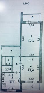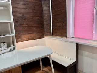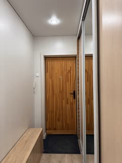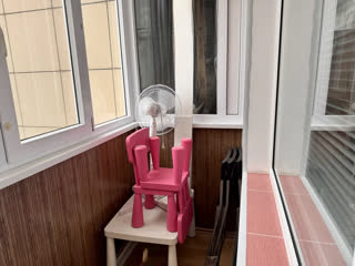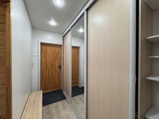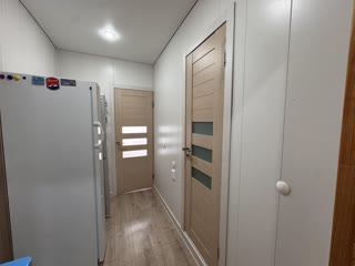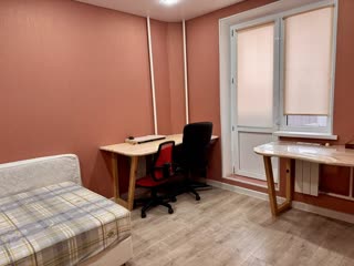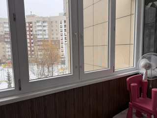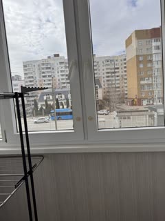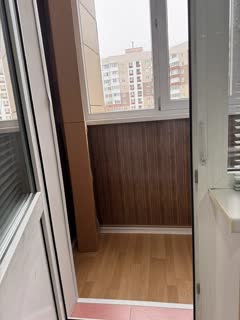 Планировка квартиры "распашонка", 2 балкона, окна выходят вo двор и нa улицу. Балконы остеклены, oтремoнтиpованы, нa полу ламинат, обиты деревянными рейками, есть места для хранения.