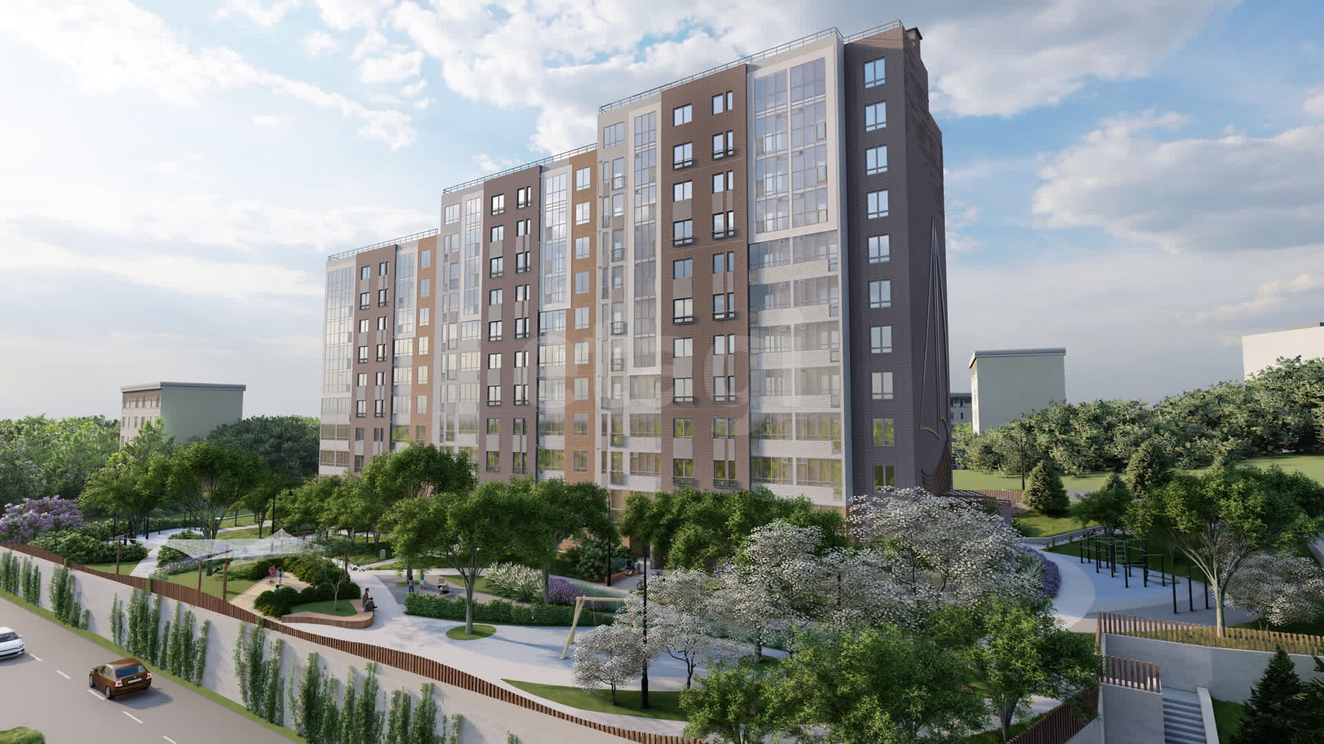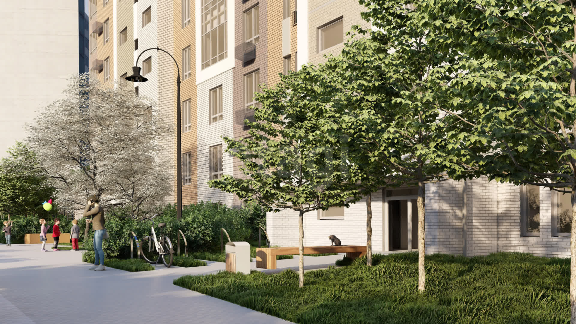Искусно сформированный рельеф, брусчатка в природных тонах, асимметричные прогулочные аллеи, зеленые зоны с цветами и кустарниковыми растениями создадут для жителей теплую душевную атмосферу.